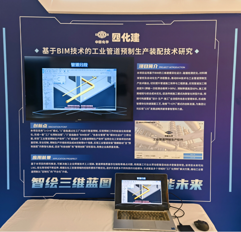 會議期間,舉行了中國化學(xué)首屆青年創(chuàng)新創(chuàng)效展,公司青年創(chuàng)新創(chuàng)效項(xiàng)目——基于BIM技術(shù)的工業(yè)管道預(yù)制生產(chǎn)裝配技術(shù)研究項(xiàng)目亮相展會,通過視頻、圖文及展板講解等多種形式,全方位展示了項(xiàng)目成果。該項(xiàng)目通過“1+3+N”模式推動施工數(shù)字化轉(zhuǎn)型,預(yù)制率提升至60%,為傳統(tǒng)施工模式注入數(shù)智化動力。
