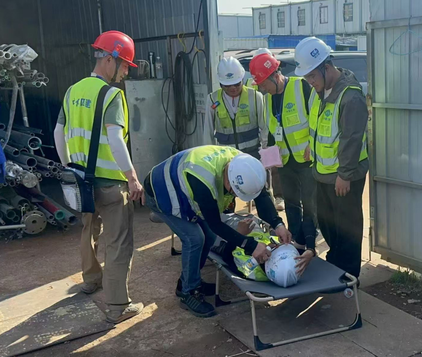 演練緊密貼合施工現(xiàn)場實際,模擬1名作業(yè)人員在登高作業(yè)時因安全帶使用不當(dāng)發(fā)生墜落的突發(fā)場景。事故發(fā)生后,現(xiàn)場立即啟動應(yīng)急預(yù)案,迅速組建醫(yī)療救治、資源保障、搶險救援、通訊聯(lián)絡(luò)、疏散避險、治安維護(hù)等6個專業(yè)小組。各小組協(xié)同配合完成從事故報警、應(yīng)急響應(yīng)到傷員轉(zhuǎn)運的全流程處置,演練過程銜接緊密、操作規(guī)范,充分展現(xiàn)項目團(tuán)隊的應(yīng)急反應(yīng)能力。