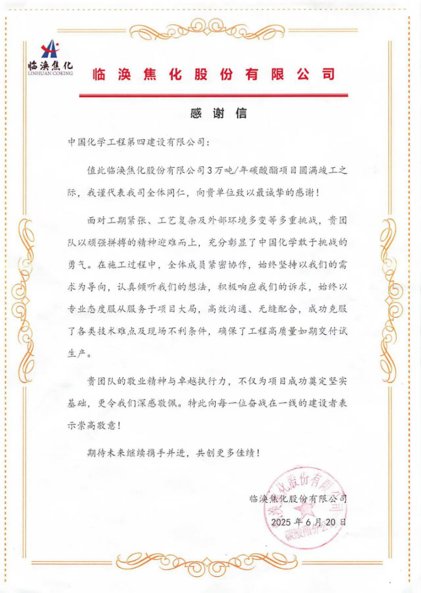 西部公司臨渙焦化碳酸酯項目部收到業主感謝信